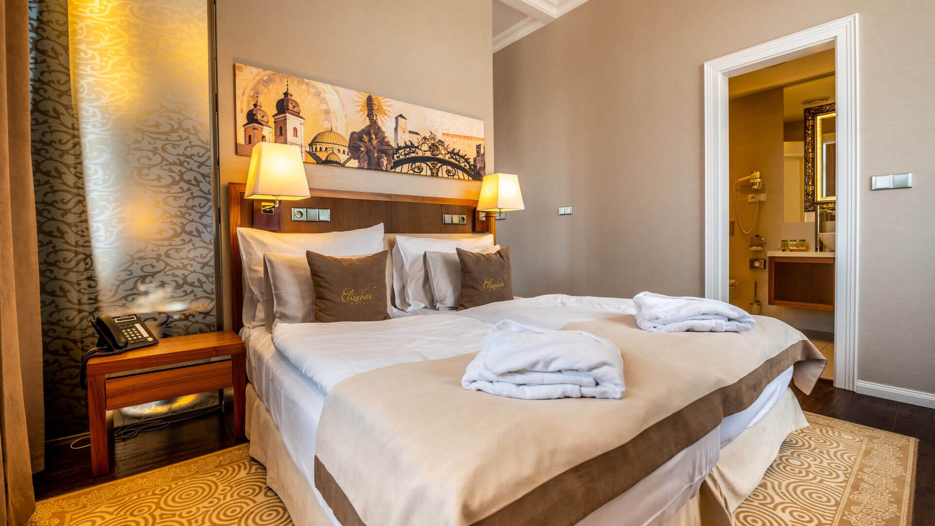 Hotel Elizabeth ponúka luxusné ubytovanie v 78 izbách štyroch typov (Superior, Deluxe, Junior, Exclusive). Celková ubytovacia kapacita hotela je spolu 143 lôžok, z toho 138 pevných lôžok a 5 prísteliek. Izby majú moderný dizajn s občasnými historizujúcimi prvkami. Tak ako celý hotel sú izby zariadené kvalitnými materiálmi, v odtieňoch sivej, hnedej či čiernej farby. Hotelové izby poskytujú maximálne pohodlie a dokonalý komfort.